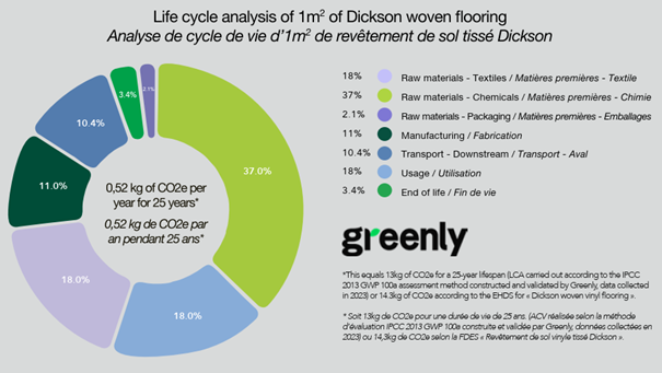 Die von Greenly, einer unabhängigen Fachorganisation, durchgeführte LCA zeigt, dass 1 m² Dickson-Gewebeboden über eine Lebensdauer von 25 Jahren 13 kg CO₂e emittiert, also 0,52 kg CO₂e pro Jahr.