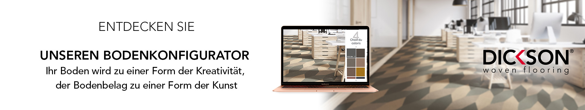 Der Dickson® Bodenkonfigurator richtet sich an Architekten und Designer, die ein Projekt simulieren möchten, bevor sie mit der Umsetzung beginnen. Mit seiner großen Auswahl an Layouts und Farben ermöglicht Ihnen Dickson® Flooring Projekt Projekte, für eine Reihe von Räumen, einschließlich Hotels, Restaurants, Büros und Geschäften, zu konfigurieren. Das Ergebnis wird dann als E-Mail mit der simulierten Visualisierung sowie ausgewählten Produktinformationen und Layouts verschickt.